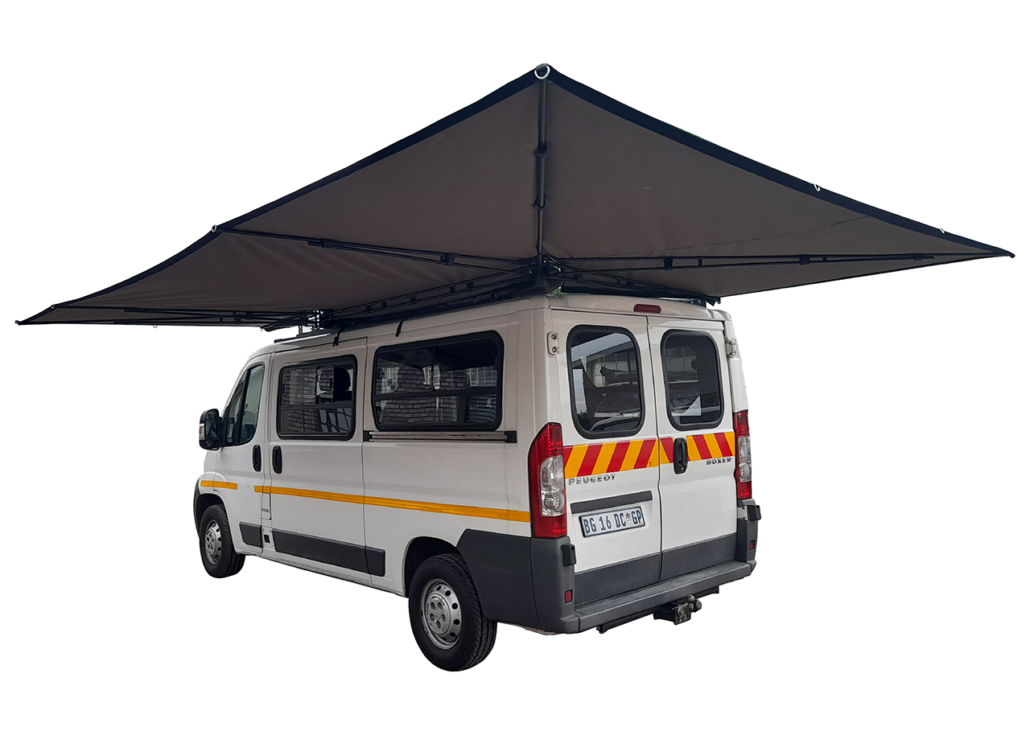 The frame is made from 304 Stainless steel 16mm x 1.5mm round tube, sandblasted and powder coated black. The material is made from Ripstop 300gsm, UV protected, 100% waterproof. The Awning can take 7 side walls to enclose the awning. Each awning comes with 7 adjustable poles and guide ropes. The awning is fitted with a aluminum loading bar to ensure Easy fitment. The length of the awning is 2.5M. The awning comes in a PVC bag. The poles come in their individual bag that fits into the awning bag. The L Shape awning is free standing with limits, if wind exceeds 15km per hour, it is recommended you use the poles and guide ropes. Color available Olive Green and Dove Grey.
